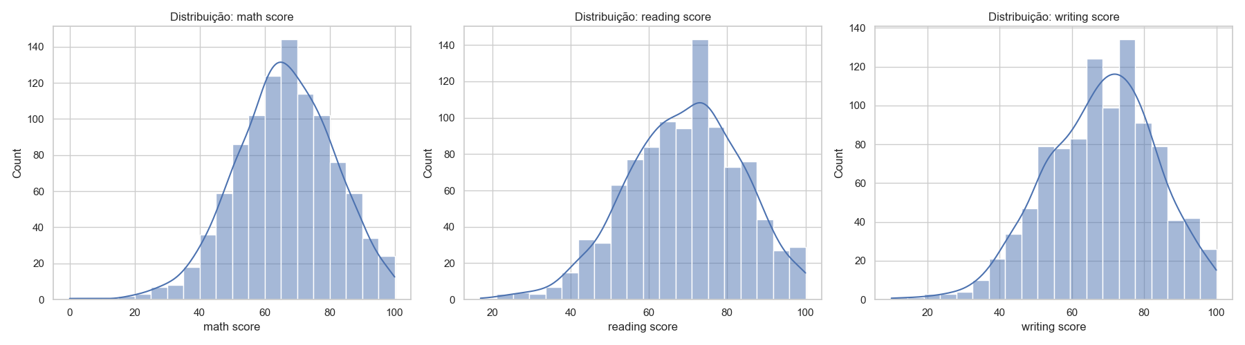 As notas apresentam média próxima de 66-69, com desvio padrão em torno de 15. Os valores mínimos e máximos mostram que há estudantes com desempenho muito baixo e muito alto.