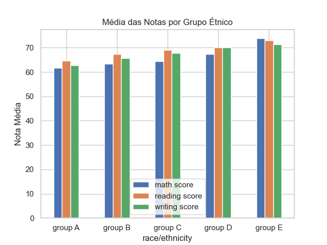 A comparação entre grupos é uma etapa importante para identificar possíveis desigualdades, padrões de desempenho e oportunidades de intervenção. Ao analisar médias por gênero ou grupo étnico (mesmo que fictício), é possível observar tendências que podem refletir fatores sociais, pedagógicos ou estruturais.