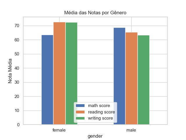 Aqui comparamos médias de desempenho entre diferentes grupos de estudantes. Para gênero, observamos diferenças nas médias das notas. Para grupo étnico, analisamos os rótulos genéricos do dataset.