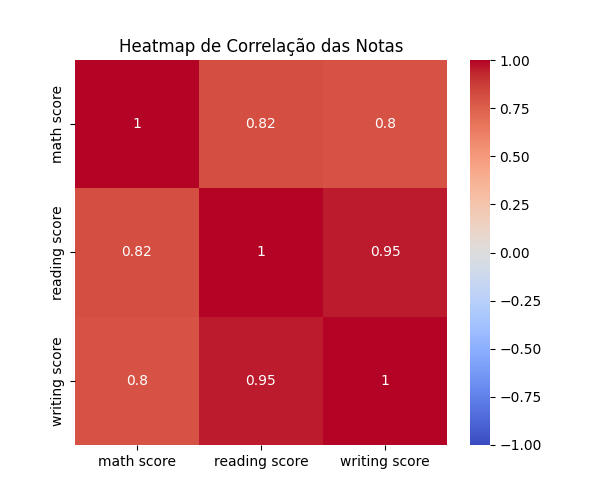 Nesta etapa, é apresentado o heatmap de correlação entre as notas dos estudantes, permitindo visualizar as relações entre matemática, leitura e escrita.