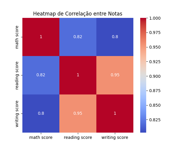 Nesta etapa, é apresentado o heatmap de correlação entre as notas dos estudantes, permitindo visualizar as relações entre matemática, leitura e escrita.