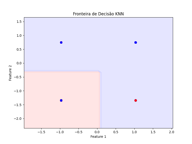 A matriz de confusão apresentada acima permite avaliar quantitativamente os acertos e erros do modelo KNN. Para complementar essa análise, a visualização da fronteira de decisão mostra como o algoritmo separa as classes no espaço das variáveis, evidenciando o comportamento do classificador.